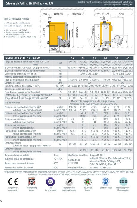 La regulación por sonda Lambda permite a la caldera reconocer el tipo de combustible utilizado, sea astilla todavía verde del bosque o sean virutas secas, pellet, etc., y conseguir una combustión de alta eficiencia. La caldera además tiene, con limpieza automática de la parrilla de combustión, cámara de combustión en material refractario, limpieza automática completa del intercambiador de calor y de la cámara de combustión. Esta tecnología asegura bajas emisiones, alta eficiencia, menor consumo de energía eléctrica, máxima seguridad de operación, manejo sencillo y costos de mantenimiento mínimos. El sistema modular de alimentación de astillas permite utilizar astillas de 5 cm de longitud, y su rotoválvula con cuchilla permite que astillas de hasta 12 cm de longitud y 5 cm² de sección pasen sin problemas a la cámara de combustión. Esta rotoválvula también evita el retroceso del fuego. El sistema de alimentación modular permite cubrir distancias de hasta 8 m sin necesidad de cortar ni soldar piezas en la obra, de forma fácil y sencilla. Si se quiere dejar abierta la posibilidad de utilizar pellet, hay que instalar el sistema de recirculación de los gases de combustión a la caldera ETA HACK para poder utilizar pellet. La caldera ETA HACK en resumen: Parrilla basculante, cámara de combustión en material refractario, ventilador de extracción de gases para funcionamiento independiente del tiro de la chimenea, regulación con sonda lambda para reconocimiento automático del combustible, limpieza completa automática, regulación completa integrada incluyendo acumulador de ACS y regulación de circuitos con mezclador con sensor de temperatura externa, de forma que no necesita caja de control de circuitos externa.