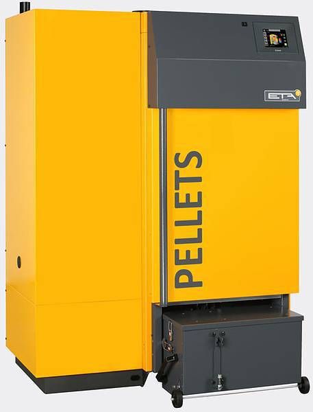 La tecnología de calderas de pellet existente actualmente no permite aumentar mucho la potencia. Por ello para potencias caloríficas mayores de 32 kW se han adaptado la ya bien comprobada caldera de astillas ETA, con sistema de aspiración de pellet y recirculación de gases decombustión esta caldera está especialmente preparada para pellets.
